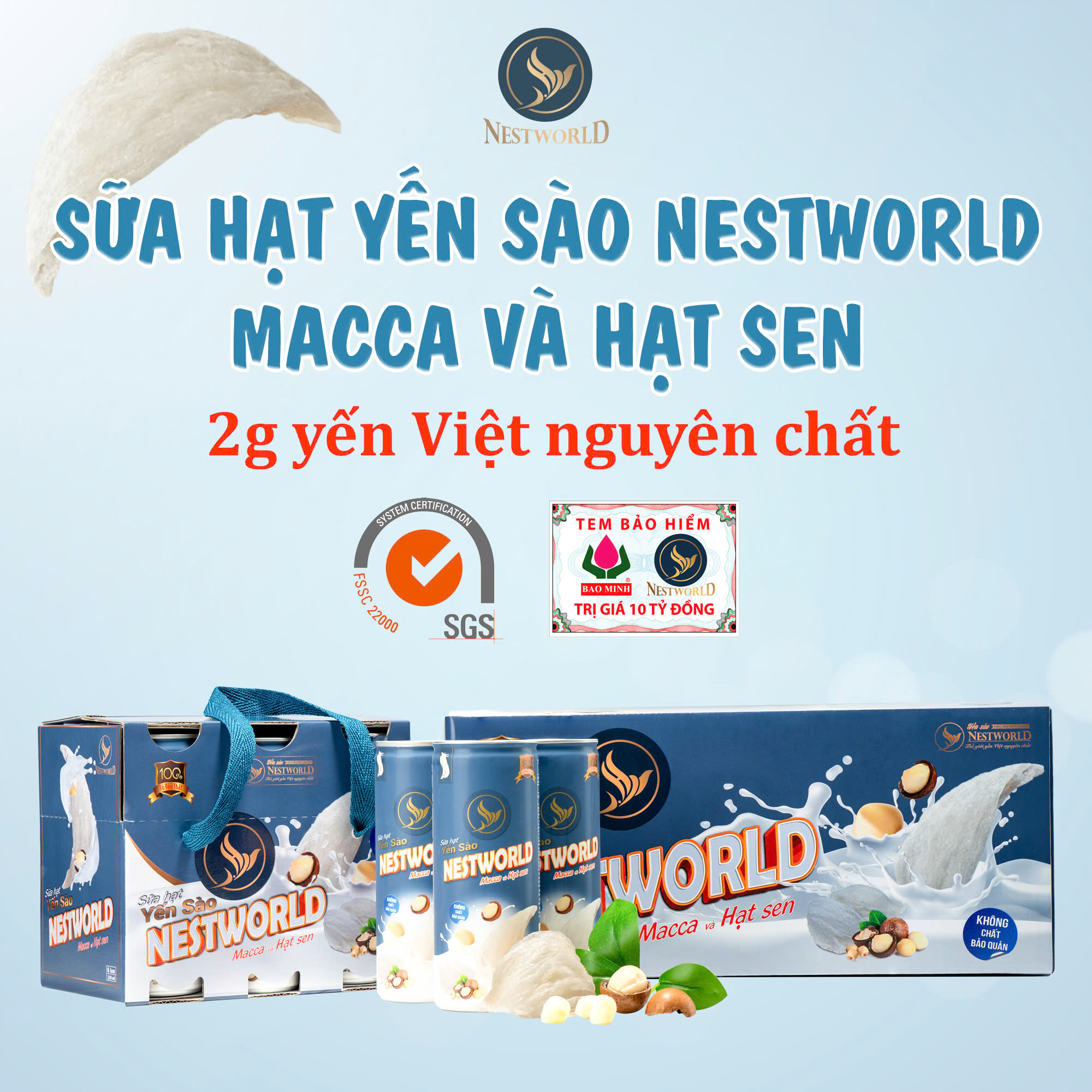 Đây là dòng sữa hạt đầu tiên trên thị trường có chứa 2gr yến sào nguyên chất với hương vị thơm bùi dễ uống, được sản xuất tại nhà máy đạt chứng nhận FSSC 22000. Đặc biệt, còn được Bảo Minh đồng ý bảo hiểm trách nhiệm sản phẩm.