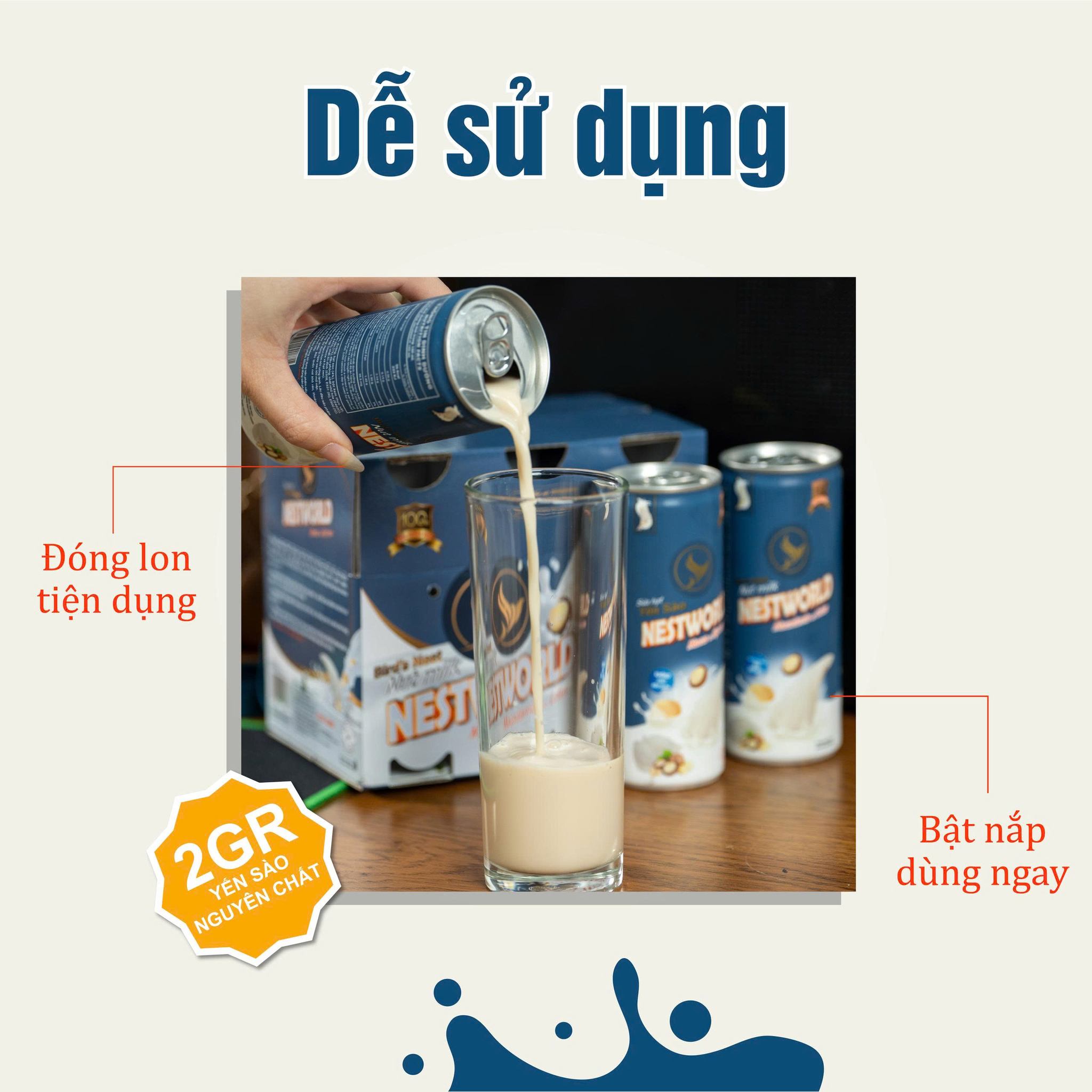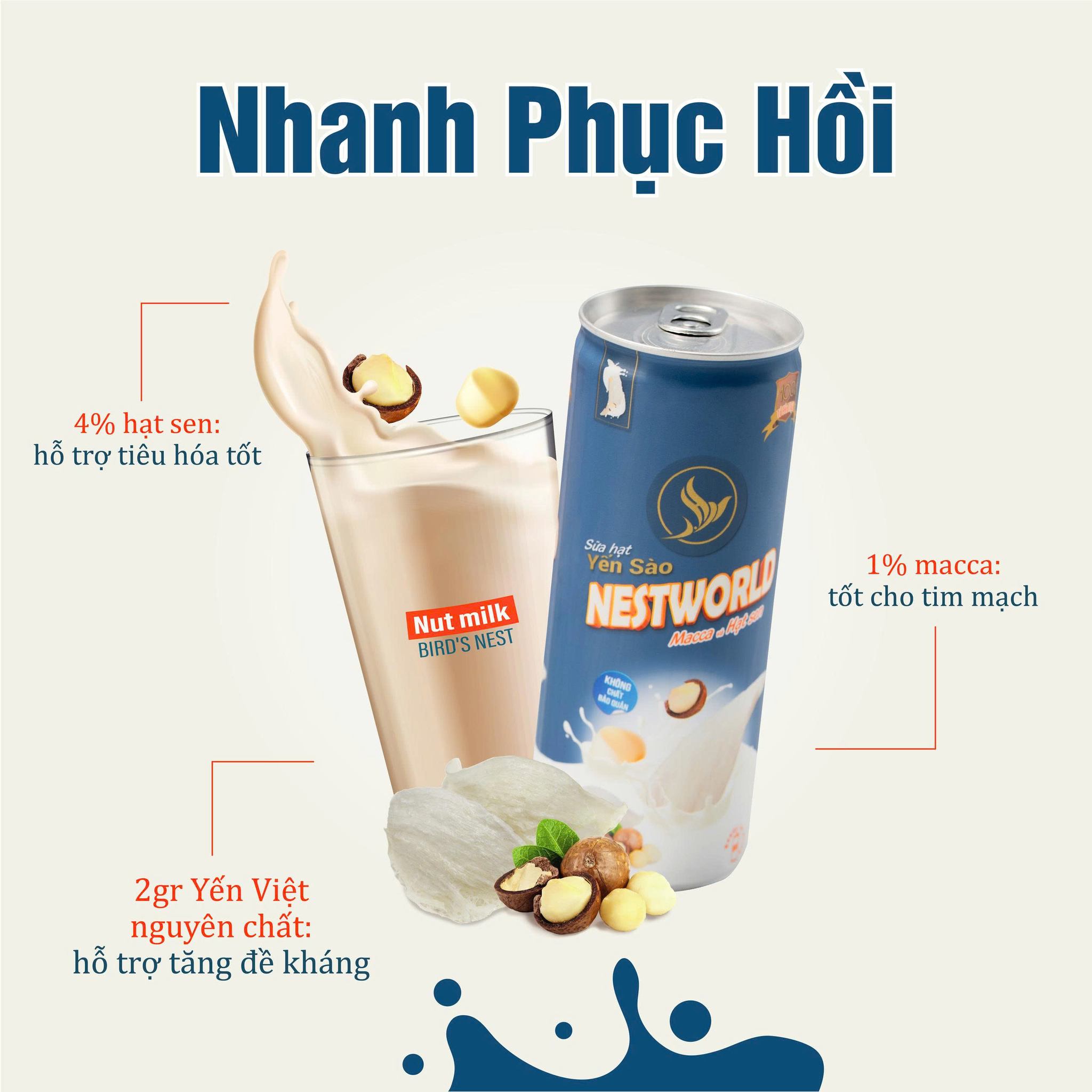 Sữa hạt yến sào Nestworld chứa 2gr yến Việt nguyên chất, 4% hạt sen và 1% macca, cung cấp đa dạng vitamin & khoáng chất hỗ trợ người bệnh tăng cường miễn dịch, nhanh chóng hồi phục thể trạng và tái tạo năng lượng.